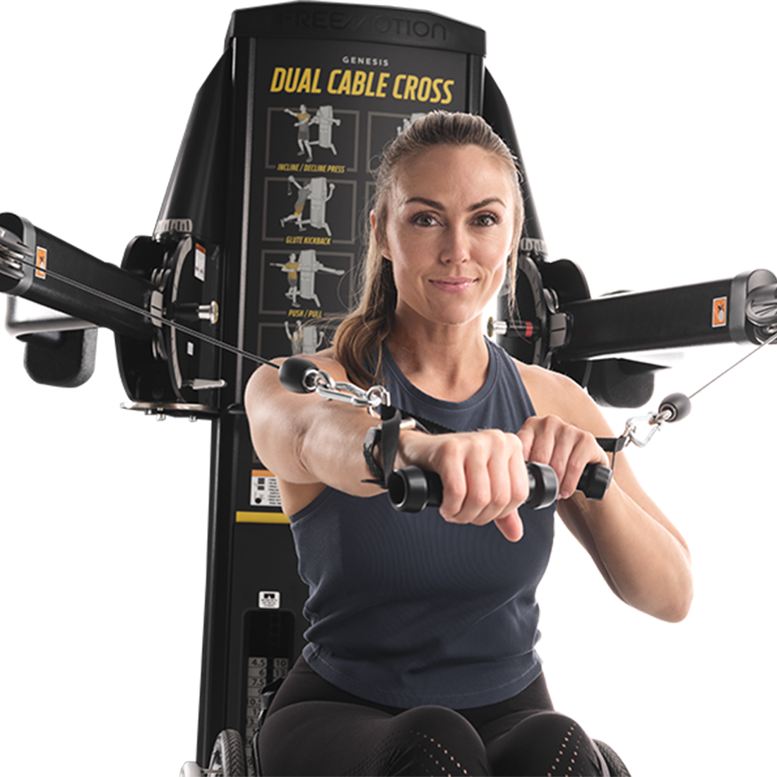 Arms adjust both vertically and horizontally. This ability to precisely position the handles allows users of all fitness levels to mimic nearly any movement in life or sport.