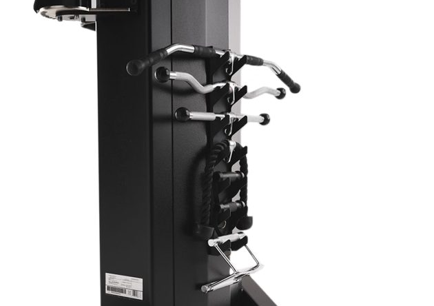 Discreetly and conveniently located on the back of the Dual Cable Cross weight stack, the optional accessory holder provides off-the-floor storage for bars and handles. Dimensions: (L x W x H) 3.0 x 4.2 x 25.8