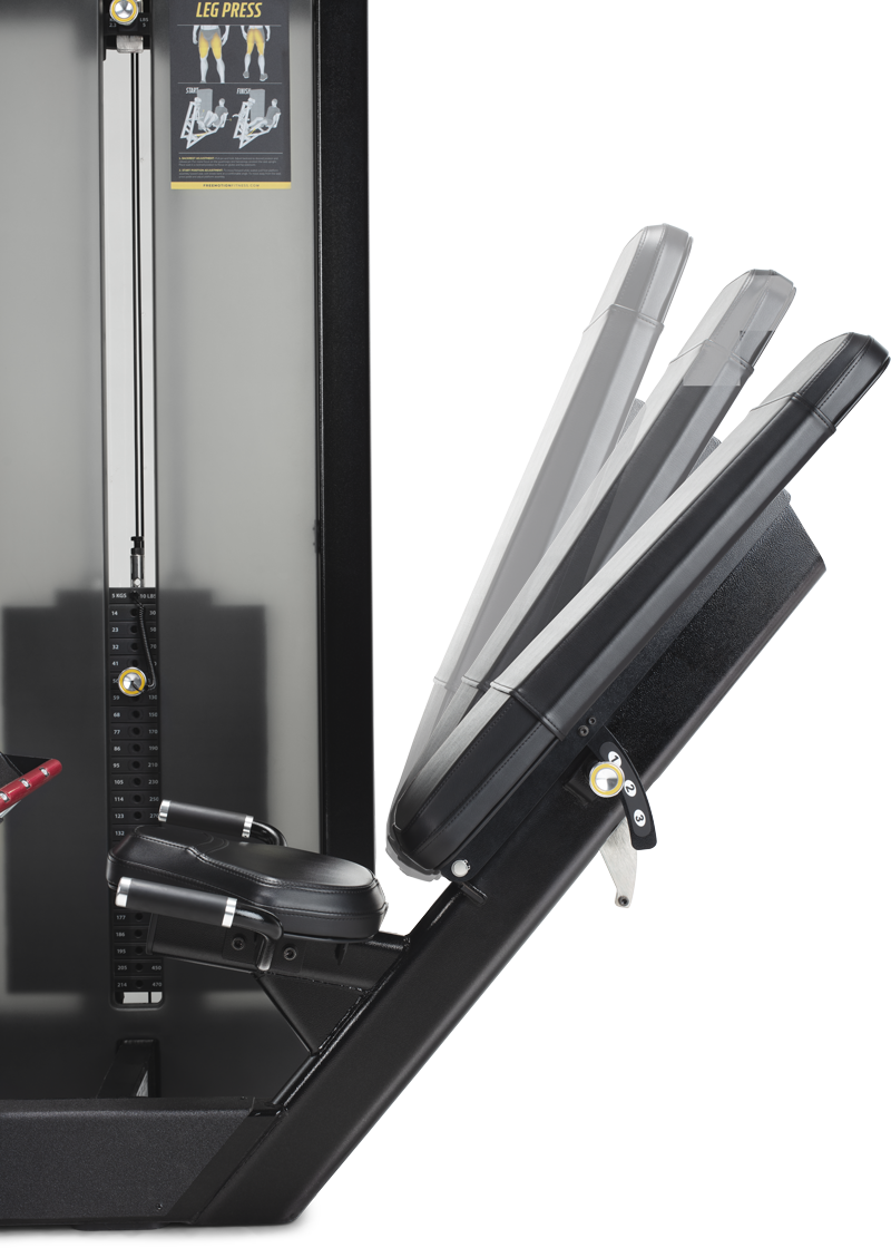 The EPIC Selectorized Leg Press's platform assembly offers a unique, arc-shaped movement pattern. It is also counterweighted for easy positioning and fluid motion. Platform release pedal disengages the