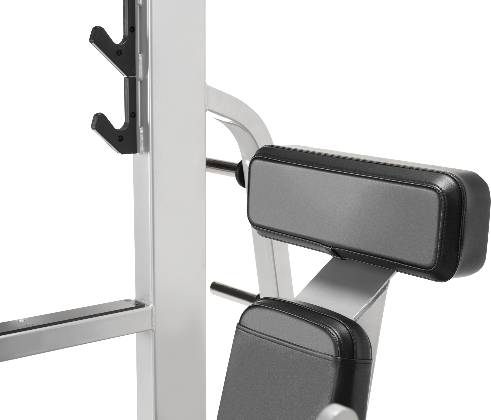 Open frame textured platform allow the spotter close proximity to the lifter. Multiple coated bar hooks offer two heights and catch bars contain dropped weight.