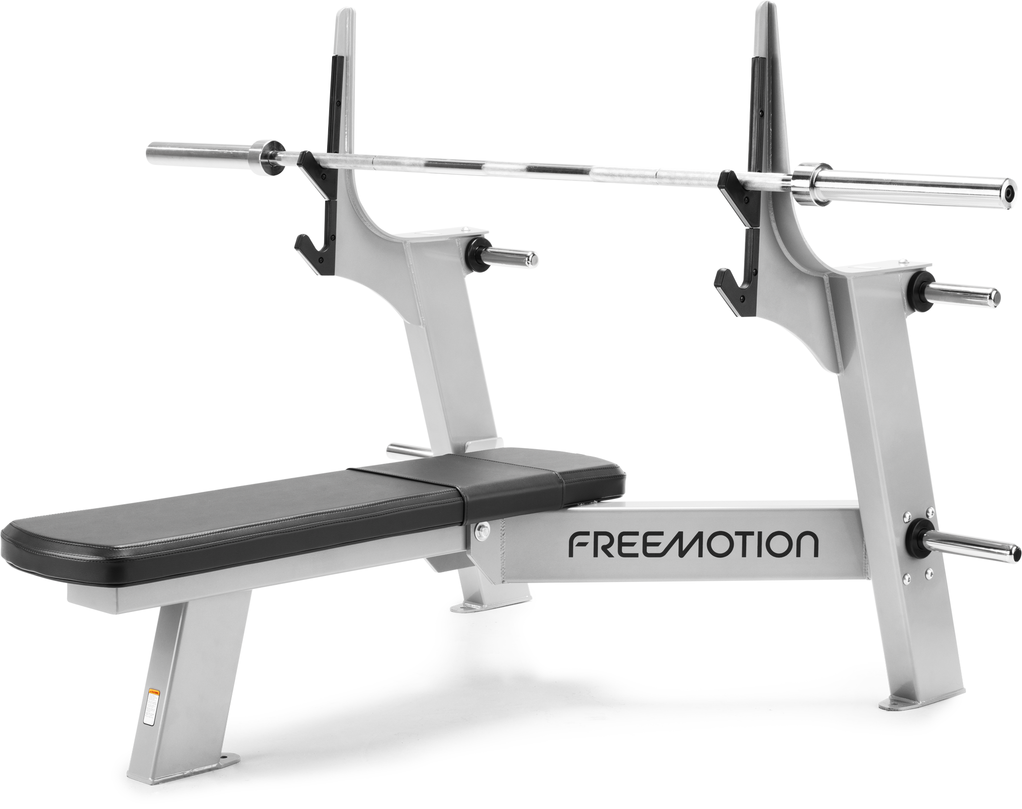 The Freemotion Olympic Flat Bench has innovative and practical design features to optimize the user's lifting experience. Y-shaped frame gets the spotter closer to the lifter. Integrated weight plate holders make it simple to change the weight. Coated bar hooks protect the unit.