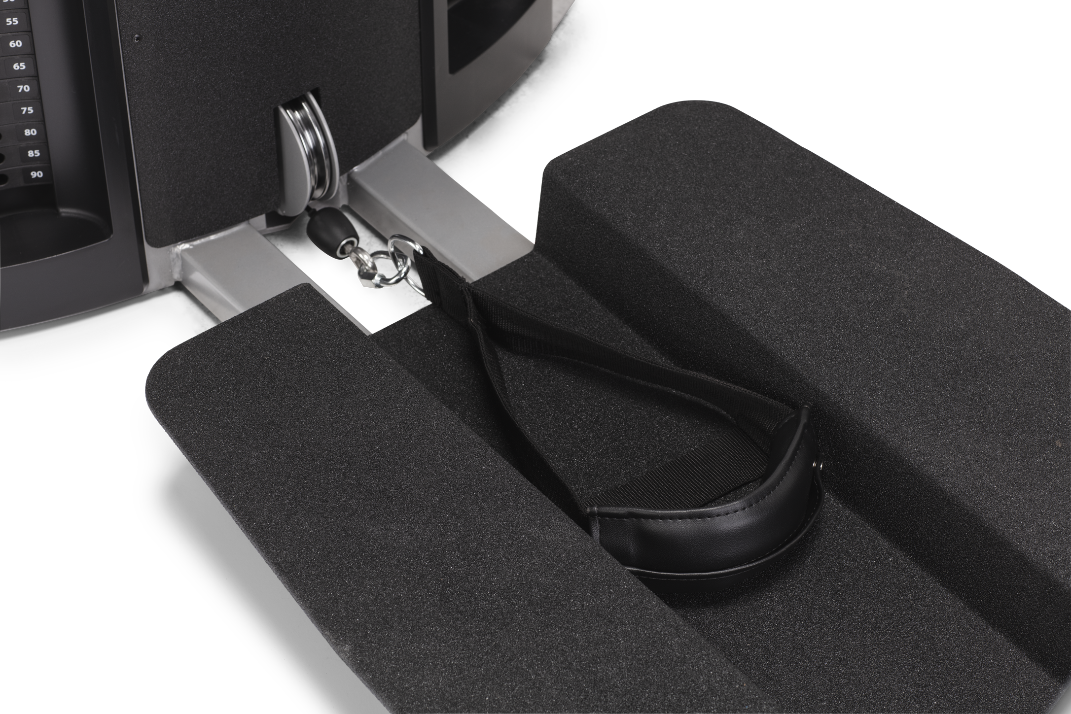 Specially designed foot harnesses help to keep feet secure throughout the movement.